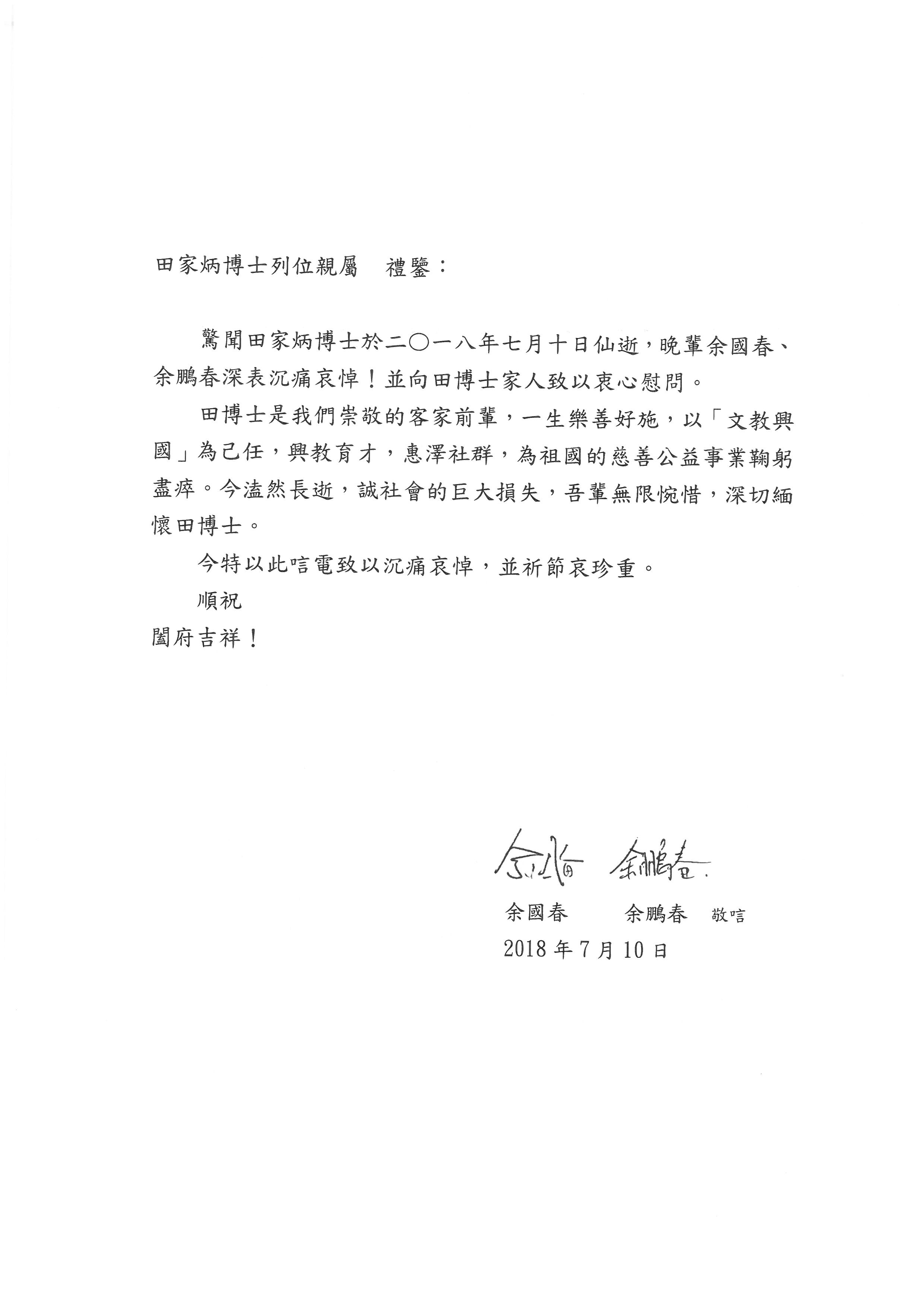 香港僑界社團聯會 余國春會長暨全體同仁 |