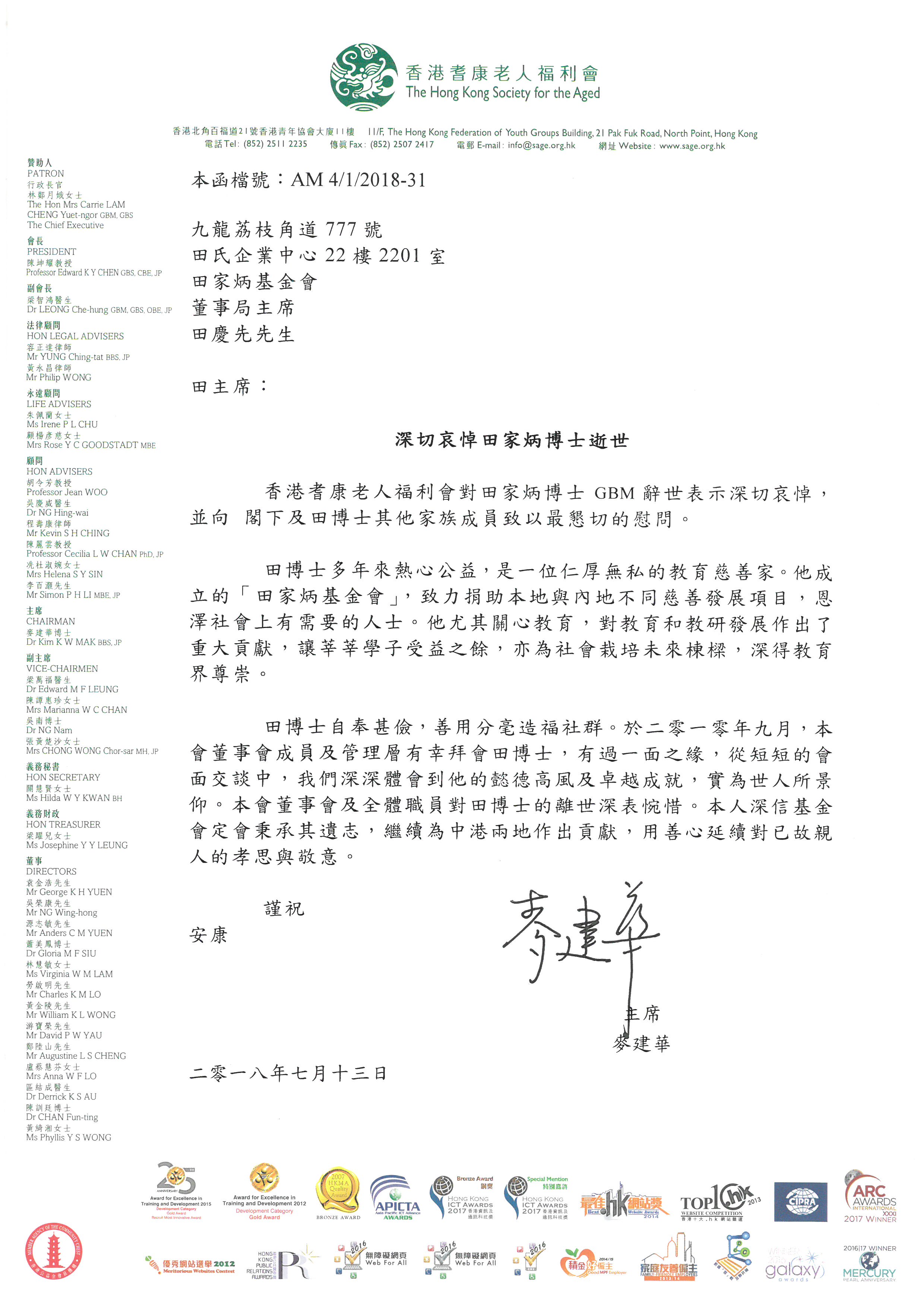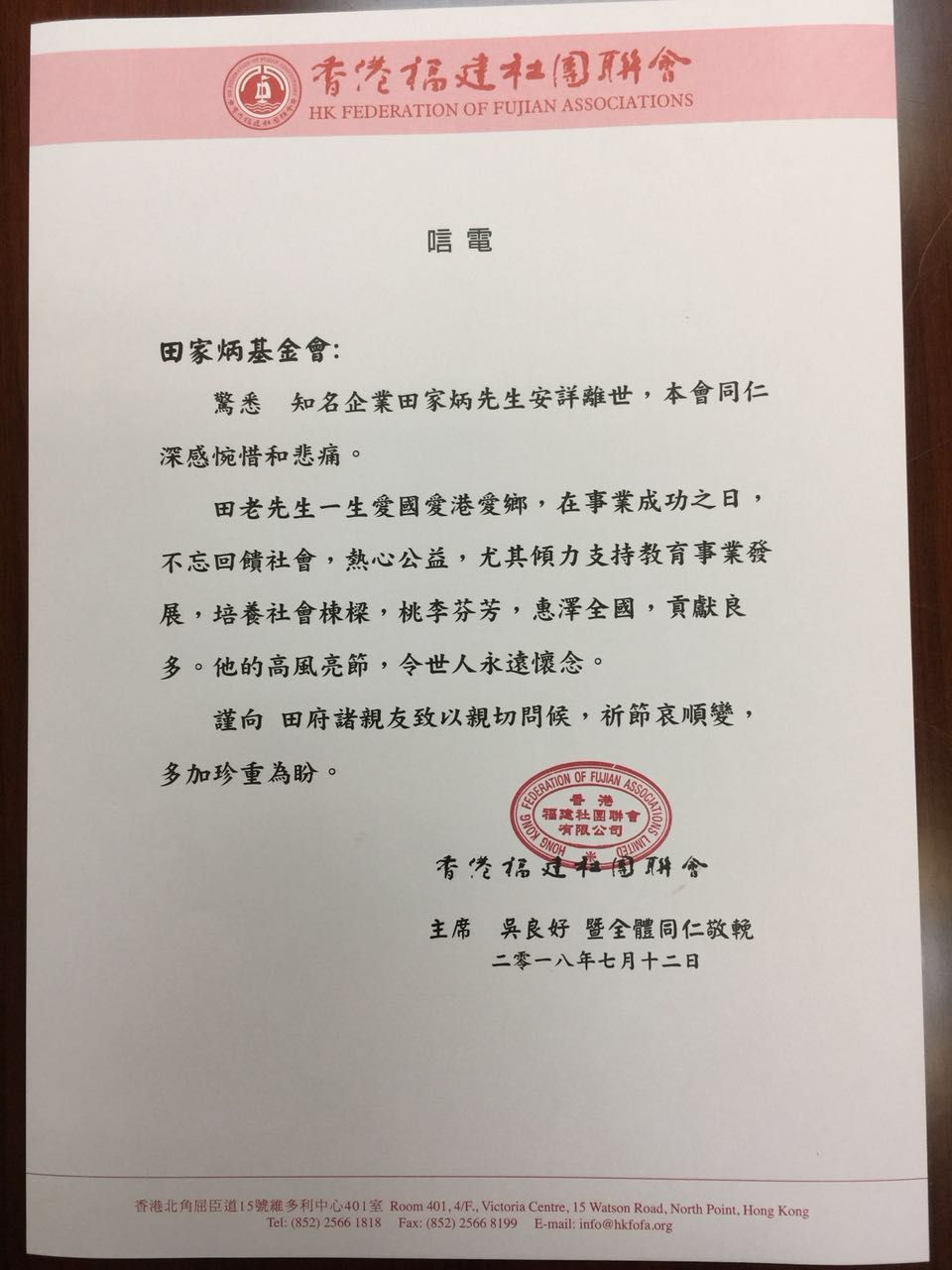 香港福建社團聯會 吳良好主席 暨全體同仁 |